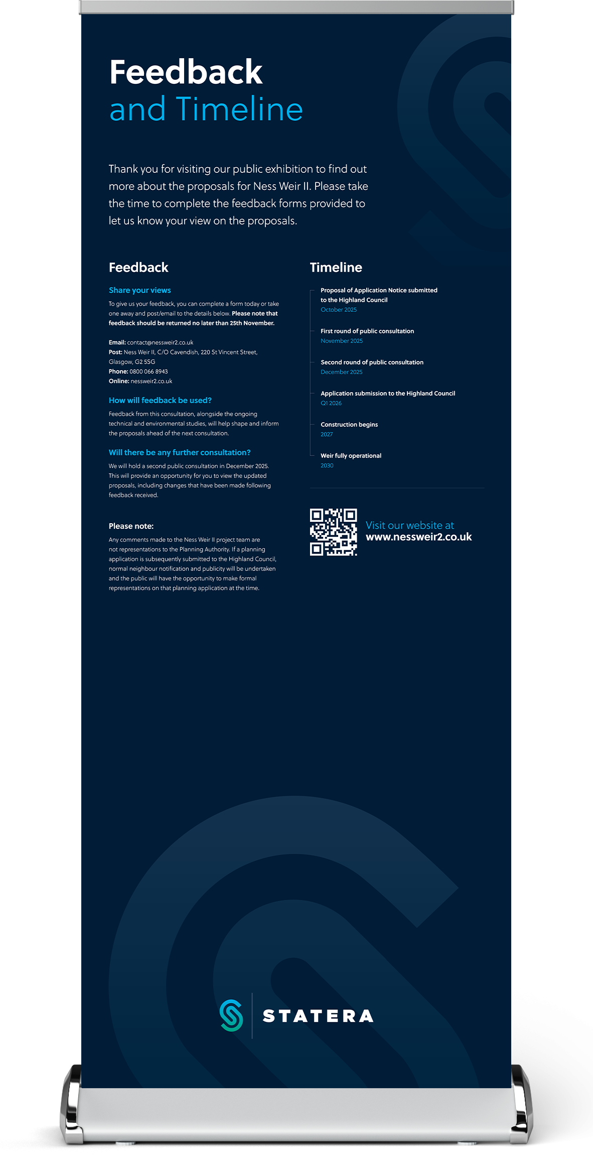 Statera Energy is grateful to everyone who attended its public consultation events in 2024 and provided valuable feedback. This feedback has been carefully considered, alongside further technical work, to develop updated proposals. The purpose of this exhibition is to share the updated proposals and obtain feedback to help further inform and shape the design for Ness Weir II.