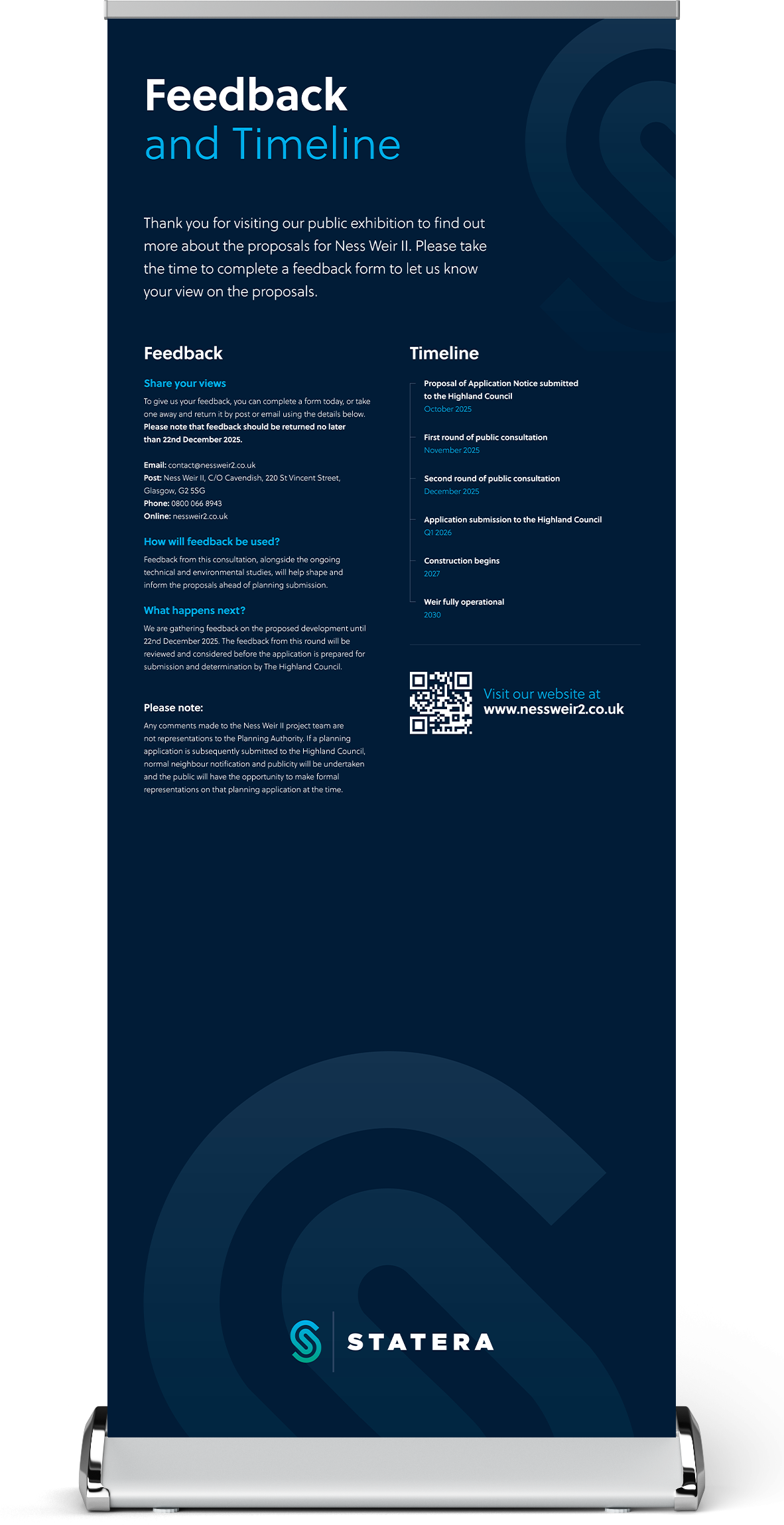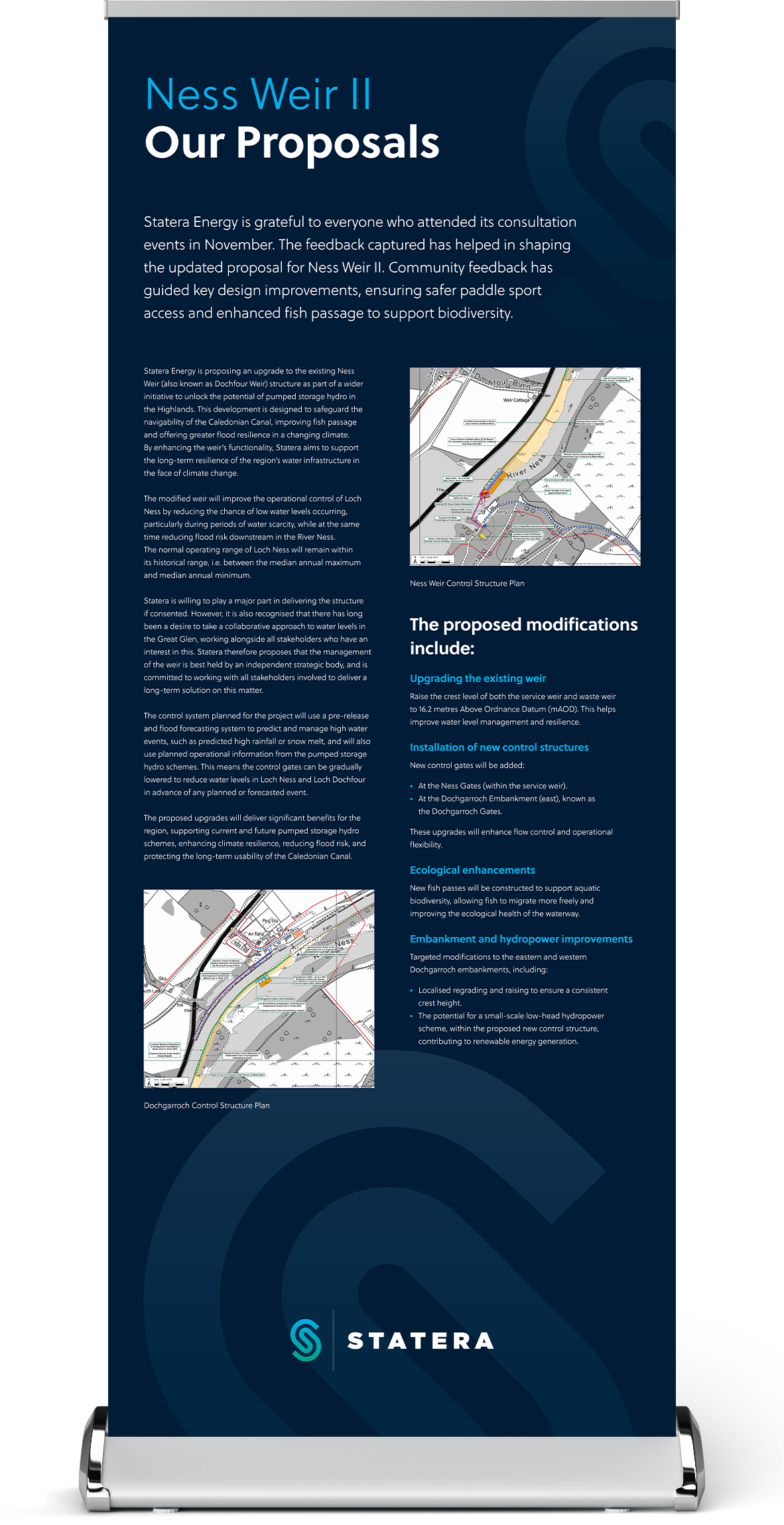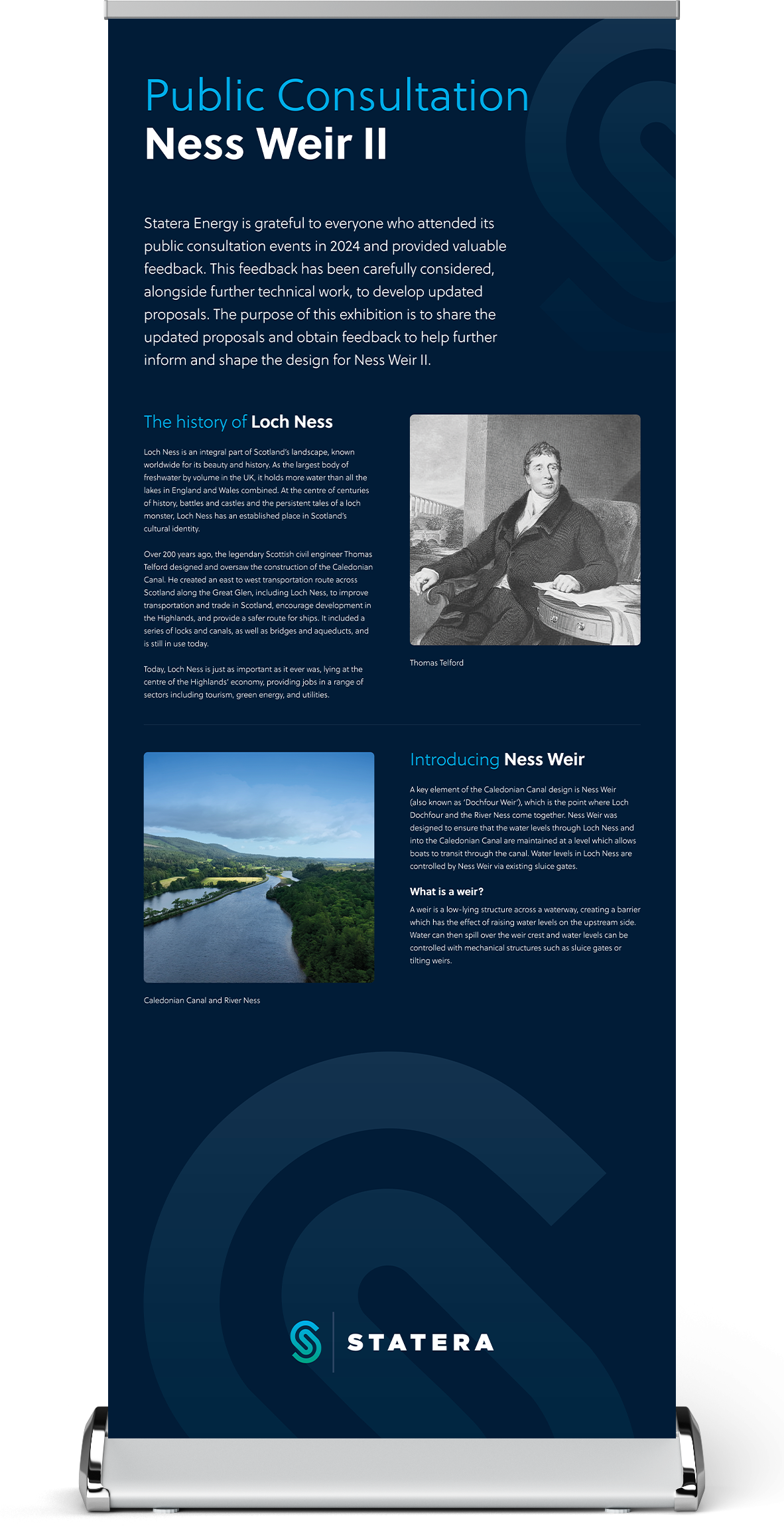Statera Energy is grateful to everyone who attended its public consultation events in 2024 and provided valuable feedback. This feedback has been carefully considered, alongside further technical work, to develop updated proposals. The purpose of this exhibition is to share the updated proposals and obtain feedback to help further inform and shape the design for Ness Weir II.
