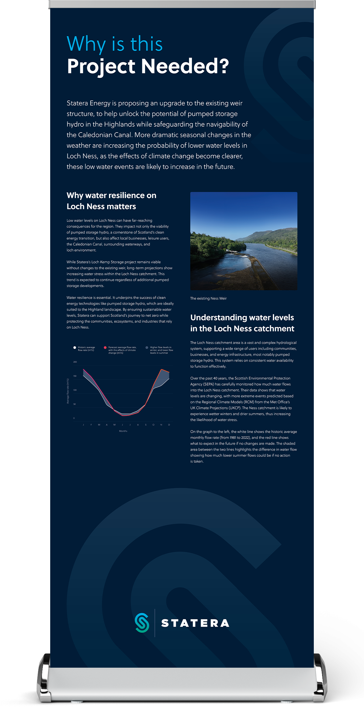 Statera Energy is proposing an upgrade to the existing weir structure, to help unlock the potential of pumped storage hydro in the Highlands while safeguarding the navigability of the Caledonian Canal. More dramatic seasonal changes in the weather are increasing the probability of lower water levels in Loch Ness, as the effects of climate change become clearer, these low water events are likely to increase in the future.