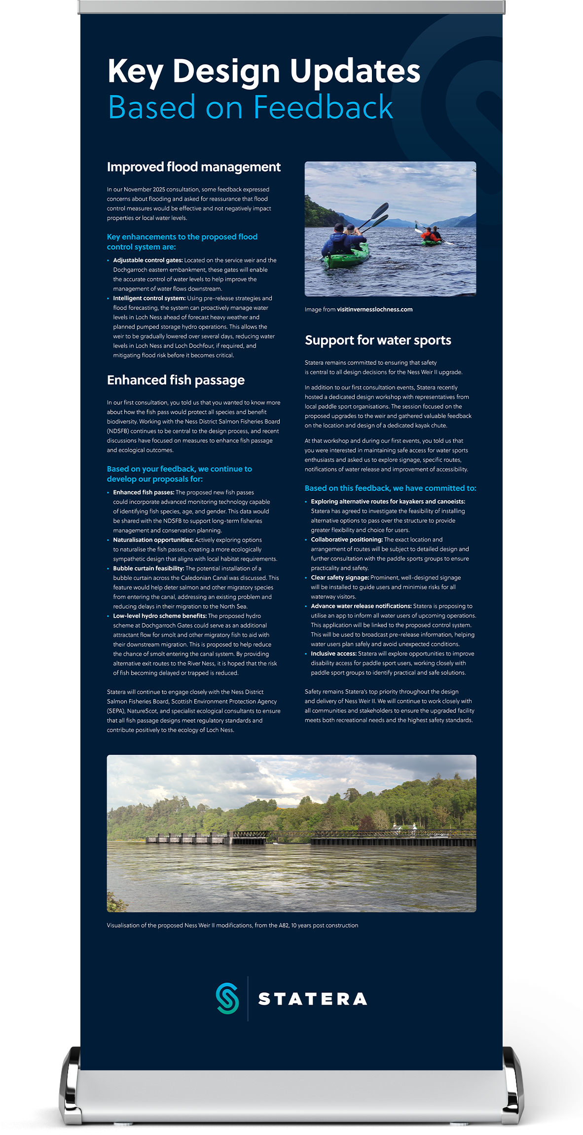- Exploring alternative routes for kayakers and canoeists: Statera has agreed to investigate the feasibility of installing alternative options to pass over the structure to provide greater flexibility and choice for users.