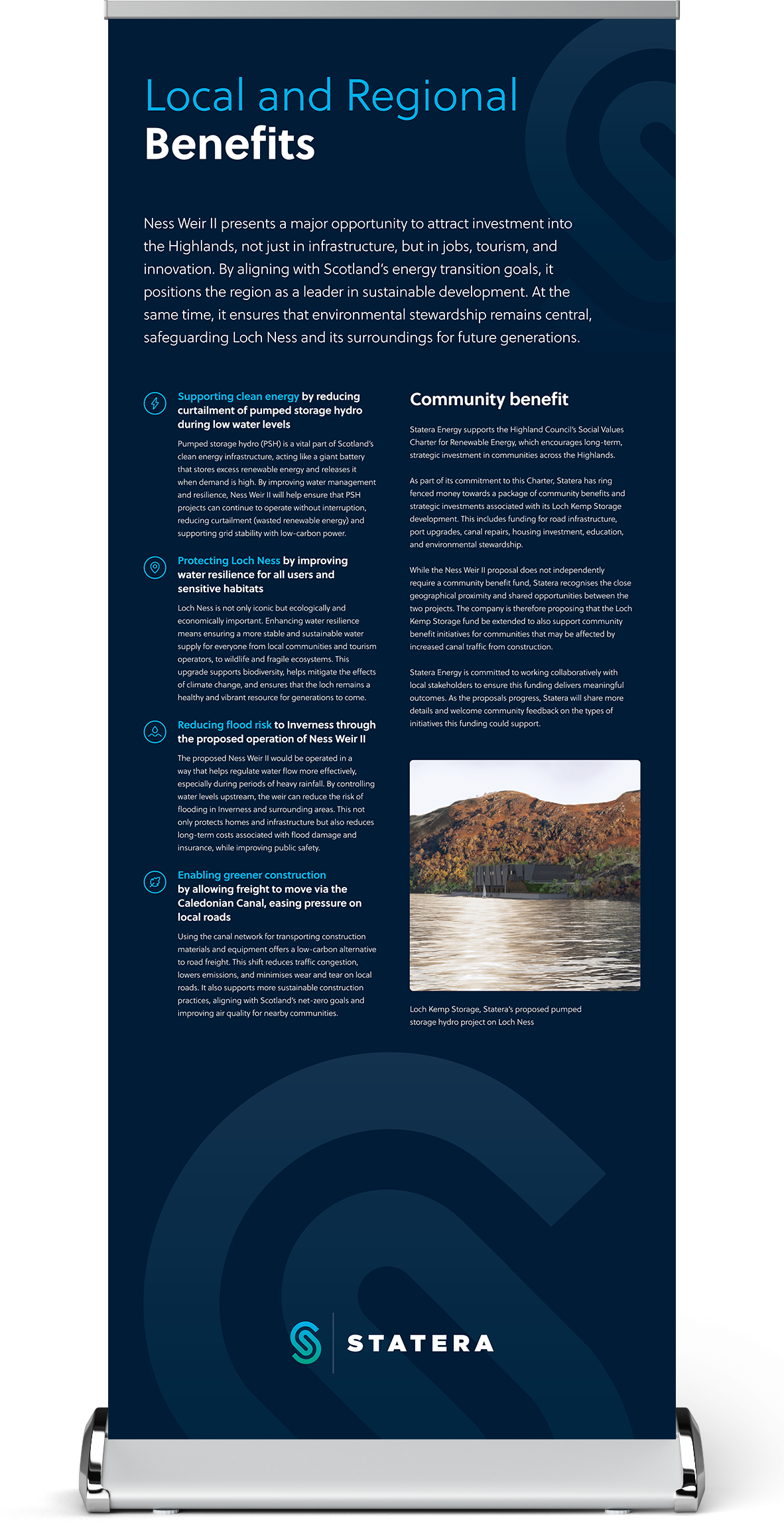 As part of its commitment to this Charter, Statera has ring fenced money towards a package of community benefits and strategic investments associated with its Loch Kemp Storage development. This includes funding for road infrastructure, port upgrades, canal repairs, housing investment, education, and environmental stewardship.