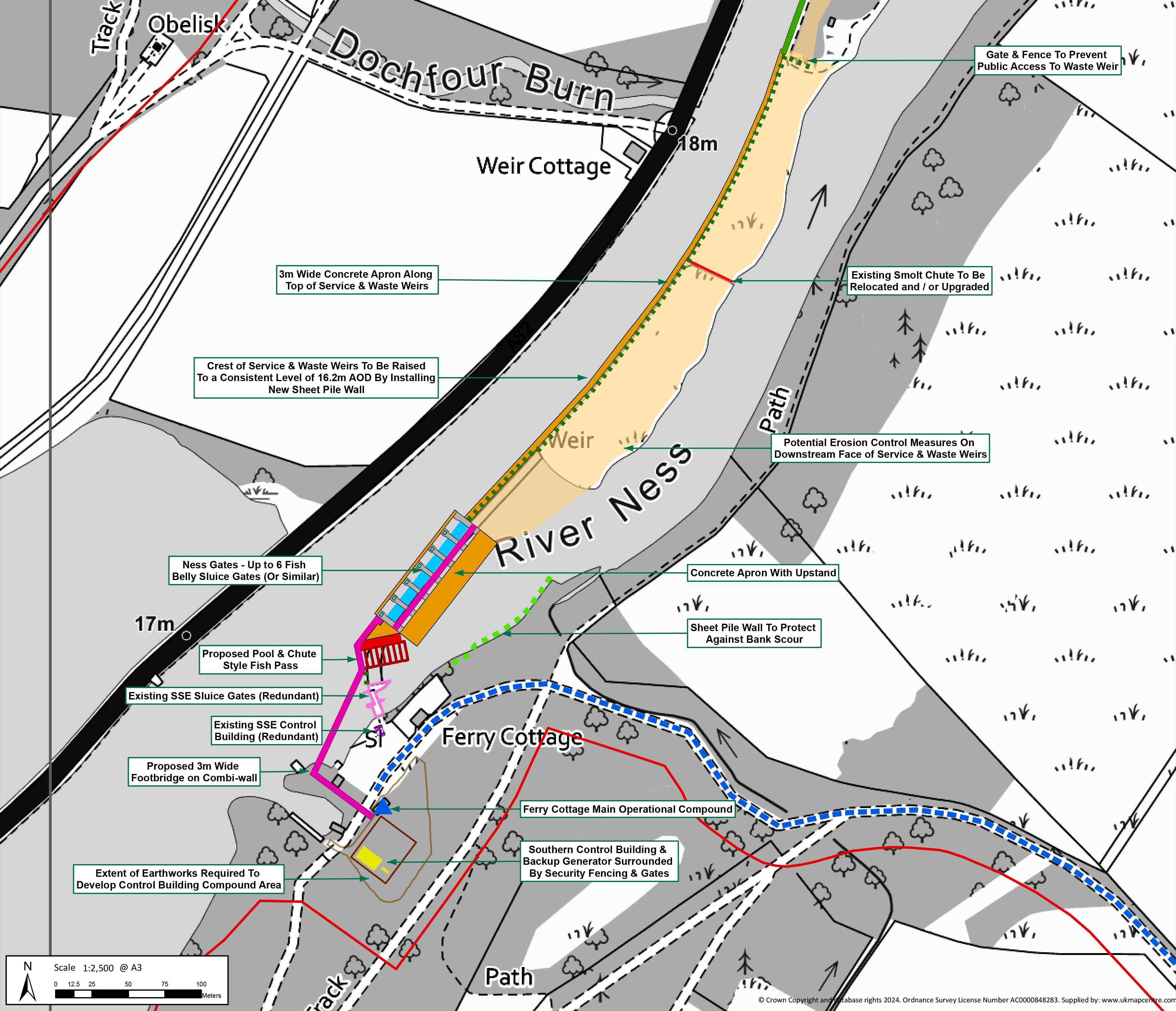 - Extreme event resilience: Ness Weir II is designed to handle a 1-in-1000-year flood event plus climate change impacts. The Dochgarroch gates would only operate in such extreme scenarios, enabling controlled water release to the River Ness.